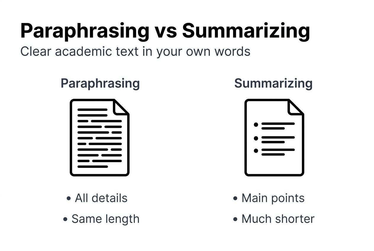 Paraphrasing rewrites all details from a passage using different words while maintaining similar length. Summarizing condenses content by extracting only main points and removing supporting examples or explanations. Use paraphrasing when you need to discuss specific details and summarizing when brevity matters more than comprehensiveness.